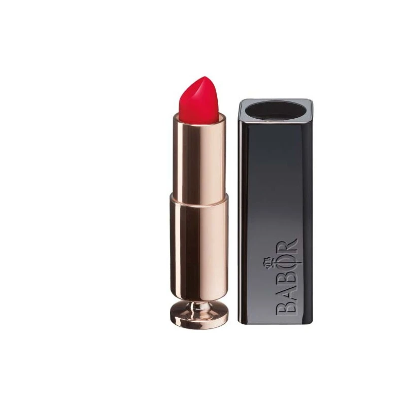 Aplicar Creamy Lip Colour en el labio superior, de dentro a fuera, luego continuar del mismo modo en el labio inferior. Secar suavemente el interior con un pañuelo para evitar que quede color en los dientes.