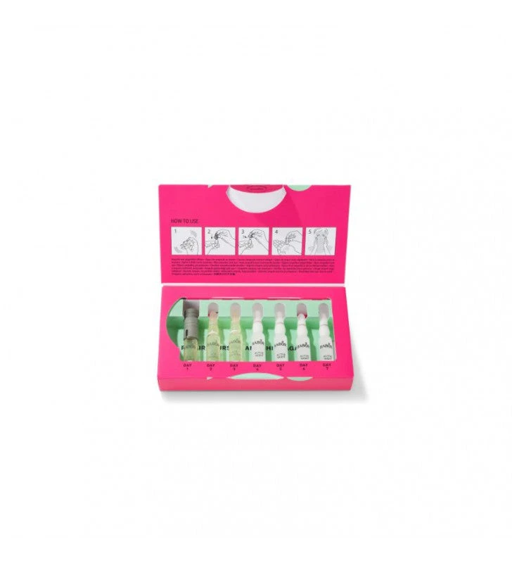 Después de la limpieza, agitar la ampolla y cubrir el cuello de la ampolla con un pañuelo cosmético o con el abridor de ampollas adjunto. Sostener la ampolla por el cuello o el abridor y rompa el anillo blanco inferior con un movimiento brusco. Poner el concentrado en la palma de su mano y luego aplicar en la cara, el cuello y el escote. Golpear suavemente en la piel.