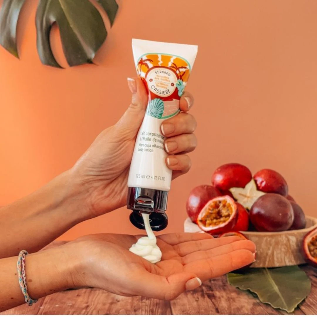 - Aceite de maracuyá reciclado: su suave textura se adhiere fácilmente en la piel, aportando una hidratación profunda y prolongada, evitando que se seque. Además, es rico en ácidos grasos esenciales, que fortalecen la barrera cutánea y contiene propiedades antioxidantes que protegen la piel de los radicales libres y de factores externos que la dañan, conservado su elasticidad, luminosidad y juventud.
