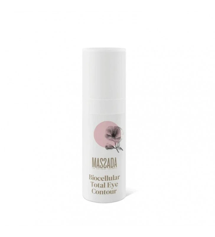 Bio Celular Total Eye Contou r de Massada cuida y protege la tan delicada zona de los ojos. Ayuda a combatir y mejorar los cuatro problemas más comunes de esa zona. Reduce la profundidad de las arrugas. Drena y mejora la circulación de las bolsas. Atenúa las ojeras mejorando su tono y luminosidad . Reafirma el contorno y eleva los párpados. Es especial para pieles maduras y jóvenes que presenten signos de envejecimiento precoz.