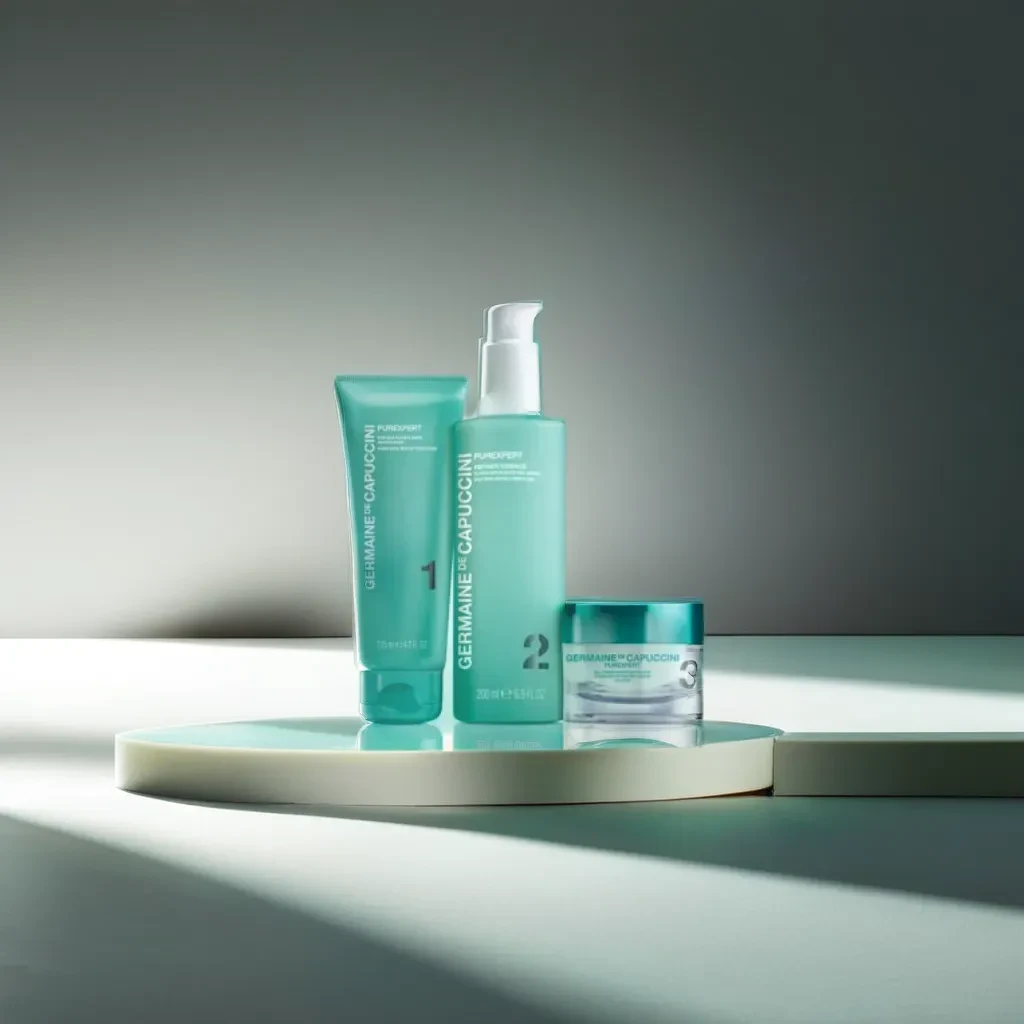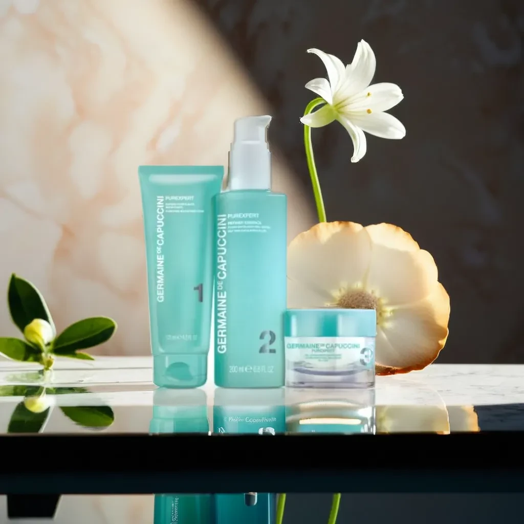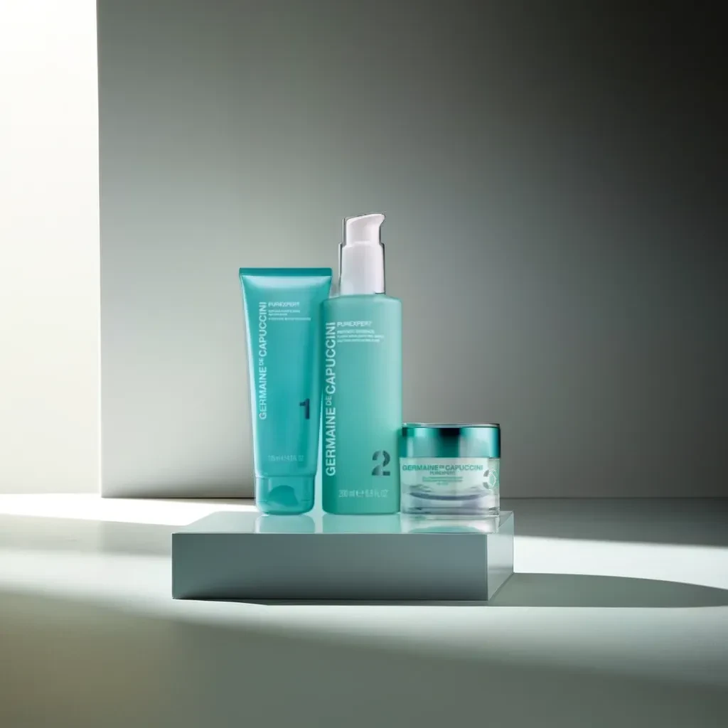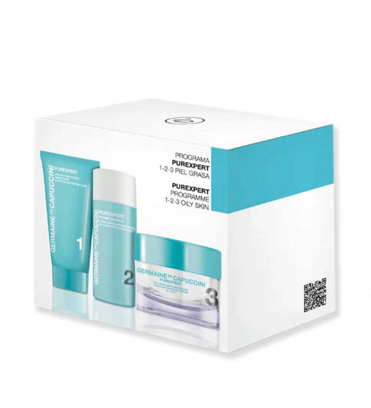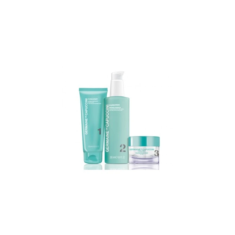 El Programa 1-2-3 de Purexpertde Germaine de Capuccini es un Pack de tres productos que contiene lo necesario para un programa completo de cuidado diario de pieles grasas en 3 pasos :