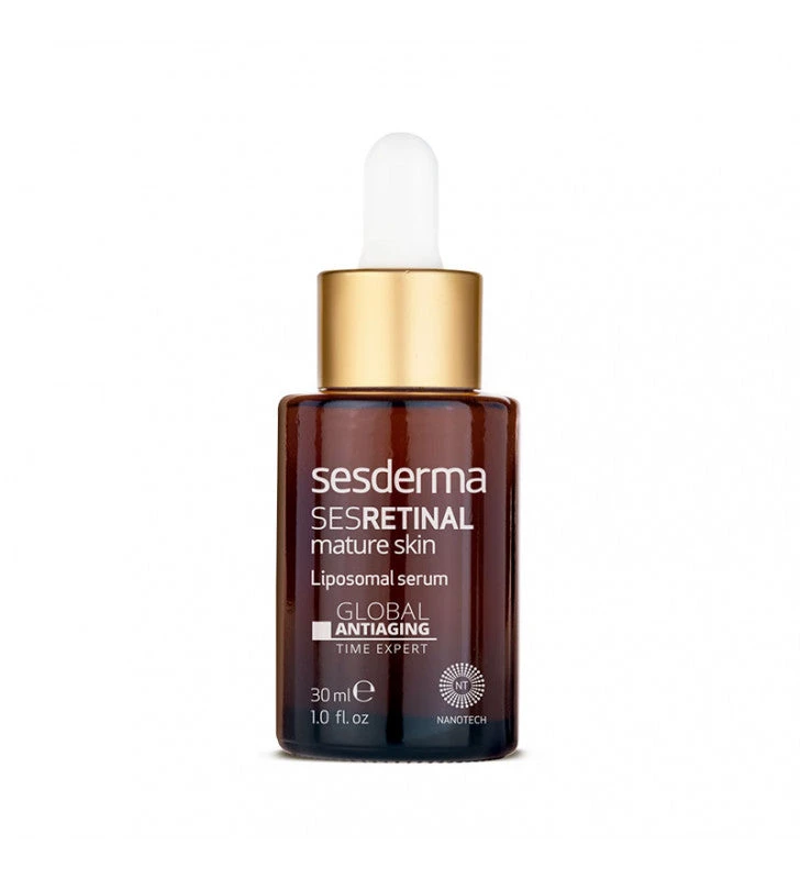 SESRETINAL Mature Skin Liposomal Serum es un sérum antiedad dermocosmético elaborado con ingredientes activos como los biorretinoides, factores de crecimiento y renitaldehido para combatir los principales signos de la edad en pieles maduras (arrugas y flacidez, principalmente).