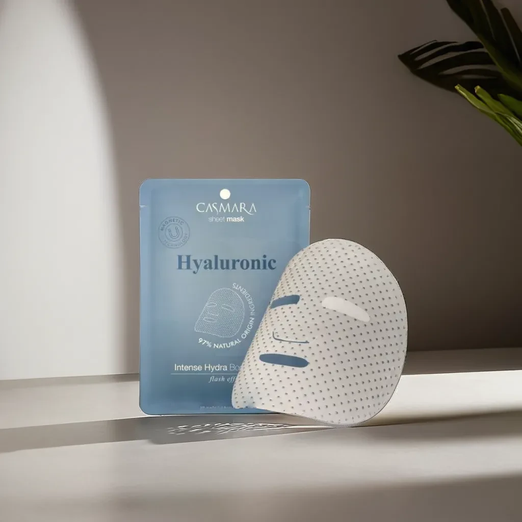 Intense Hydra Mask de Casmara Hidrata intensamente mediante la combinación de varios mecanismos: evita la deshidratación, retiene la humedad e hidrata profundamente. Aumenta la síntesis endógena de ácido hialurónico y evita su degradación. Efecto relleno de arrugas y líneas de expresión. Alivia la irritación y calma la piel. en su formulación encontraremos la combinación de 3 pesos moleculares distintos de ácido hialurónico, esto permite rellenar las arrugas e hidratar la piel en todos los niveles. Revela una piel más jugosa, suave y lisa.