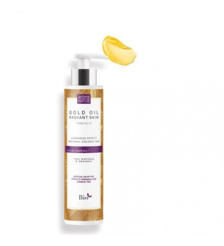 Gold Oil Radiant Skin de Aroms Natur es un aceite corporal seco gelificado que consigue una piel hidratada y nutrida. Además, proporciona un bronceado luminoso. Este aceite combina las propiedades antioxidantes, regeneradoras y nutritivas de 9 aceites únicos . Obtendrás un efecto dorado natural que ilumina la piel proporcionándole luz y resplandor. unifica el tono de la piel y reaviva la luz propia.